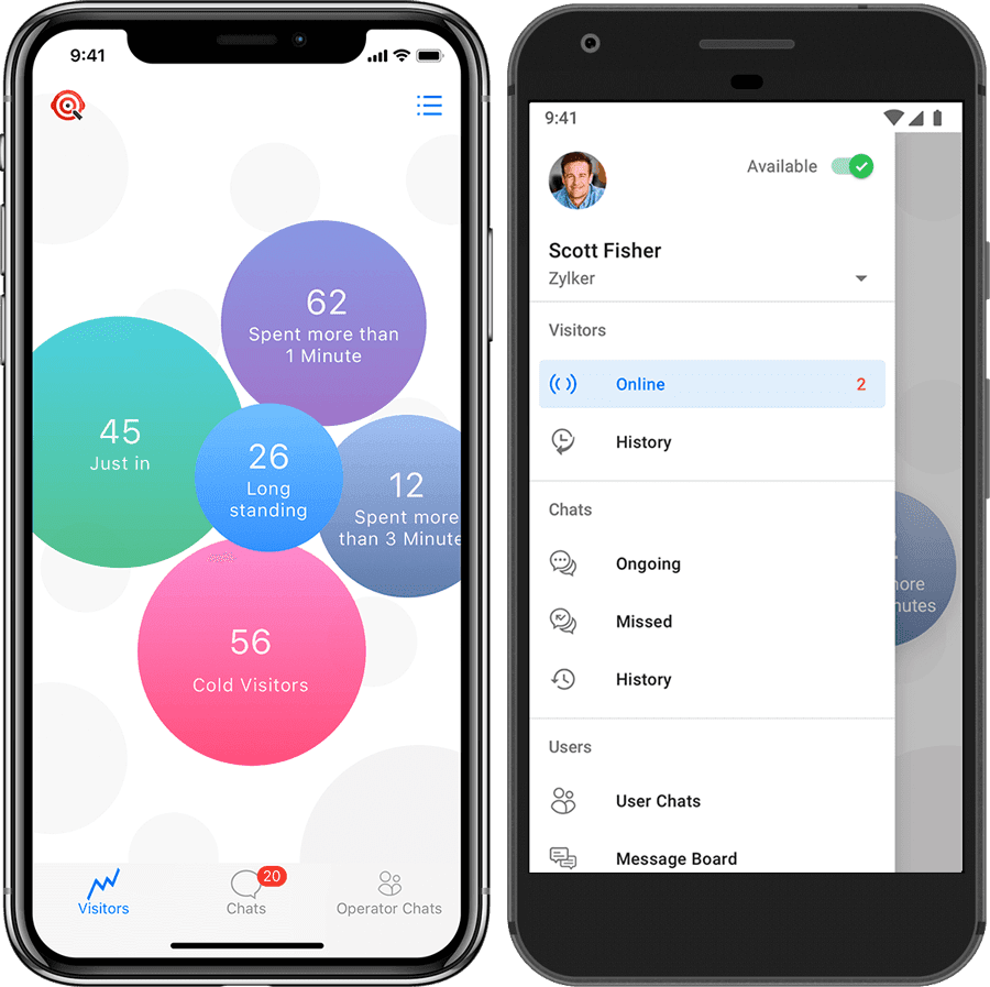 Obsługuj odwiedzających 24 godziny na dobę, 7 dni w tygodniu, korzystając z niestandardowych chatbotów. Wyszukuj potencjalnych klientów, definiując własne kwalifikatory. Użyj mobilnej aplikacji czatu na żywo SalesIQ, aby śledzić i nawiązywać kontakt z gośćmi z dowolnego miejsca.