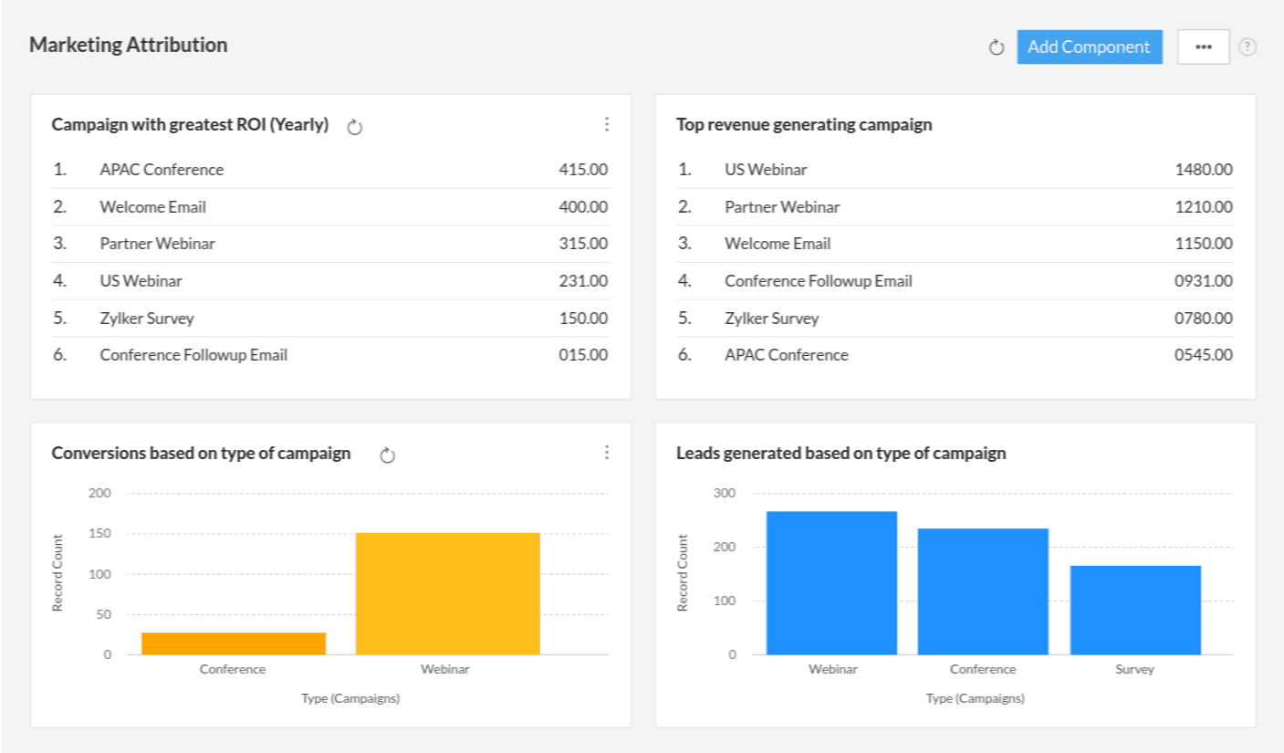 Zarządzanie kampaniami webinarowymi czy ankietowymi jeszcze nigdy nie było tak proste. Zoho CRM integruje się z różnymi usługami, umożliwiając pełną kontrolę nad każdym etapem kampanii. Od konfiguracji, przez zaproszenia i śledzenie wyników - wszystko to można zrobić z poziomu jednego narzędzia.