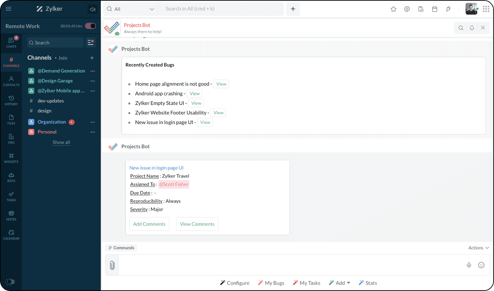 Każdy moduł oprogramowania musi zostać zweryfikowany, aby wyeliminować wszystkie błędy. Problemy z oprogramowaniem, które nie zostaną naprawione przed wdrożeniem, mogą negatywnie wpłynąć na Twoją firmę lub relacje z klientami. Możesz użyć integracji Zoho Projects z Cliq, aby znaleźć i naprawić błędy podczas fazy testowania. Zintegruj rozszerzenia, takie jak Stack Overflow, GitLab i GitHub, aby znaleźć rozwiązania dotyczące kodu oraz zarządzać kodem i współpracować nad nim w oknie czatu.