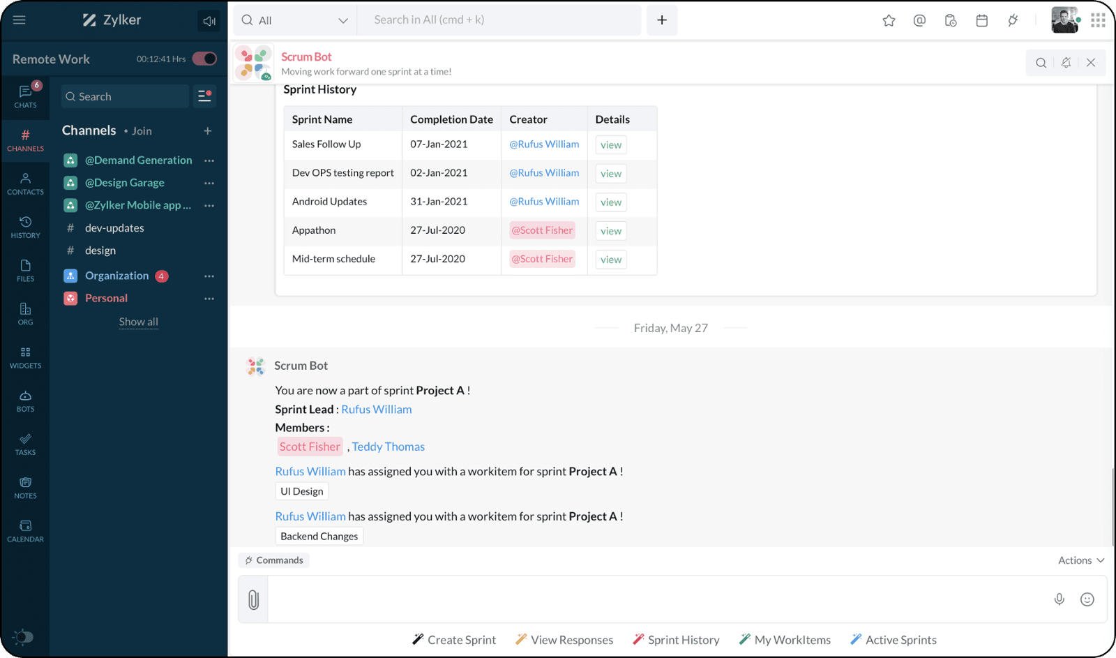 Aby proces tworzenia oprogramowania przebiegał sprawnie, potrzebujesz przejrzystego planu. W Cliq możesz utworzyć ScrumBota i zintegrować rozszerzenie Scrum dla Zoho Cliq. Możesz go używać do tworzenia i delegowania zadań dla różnych zespołów, prowadzenia spotkań i zarządzanie całym przepływem pracy bezpośrednio w Cliq .
