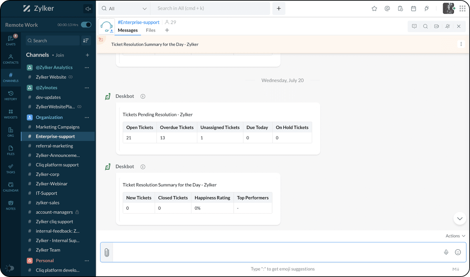 Aby śledzić opinie klientów, zespół pomocy technicznej może włączyć publikowanie powiadomień od botów bezpośrednio w kanałach zespołu, po zarejestrowaniu opinii. Możesz również cały czas być na bieżąco w otrzymywanych zgłoszeniach w Zoho Desk za pomocą DeskBot w Zoho Cliq