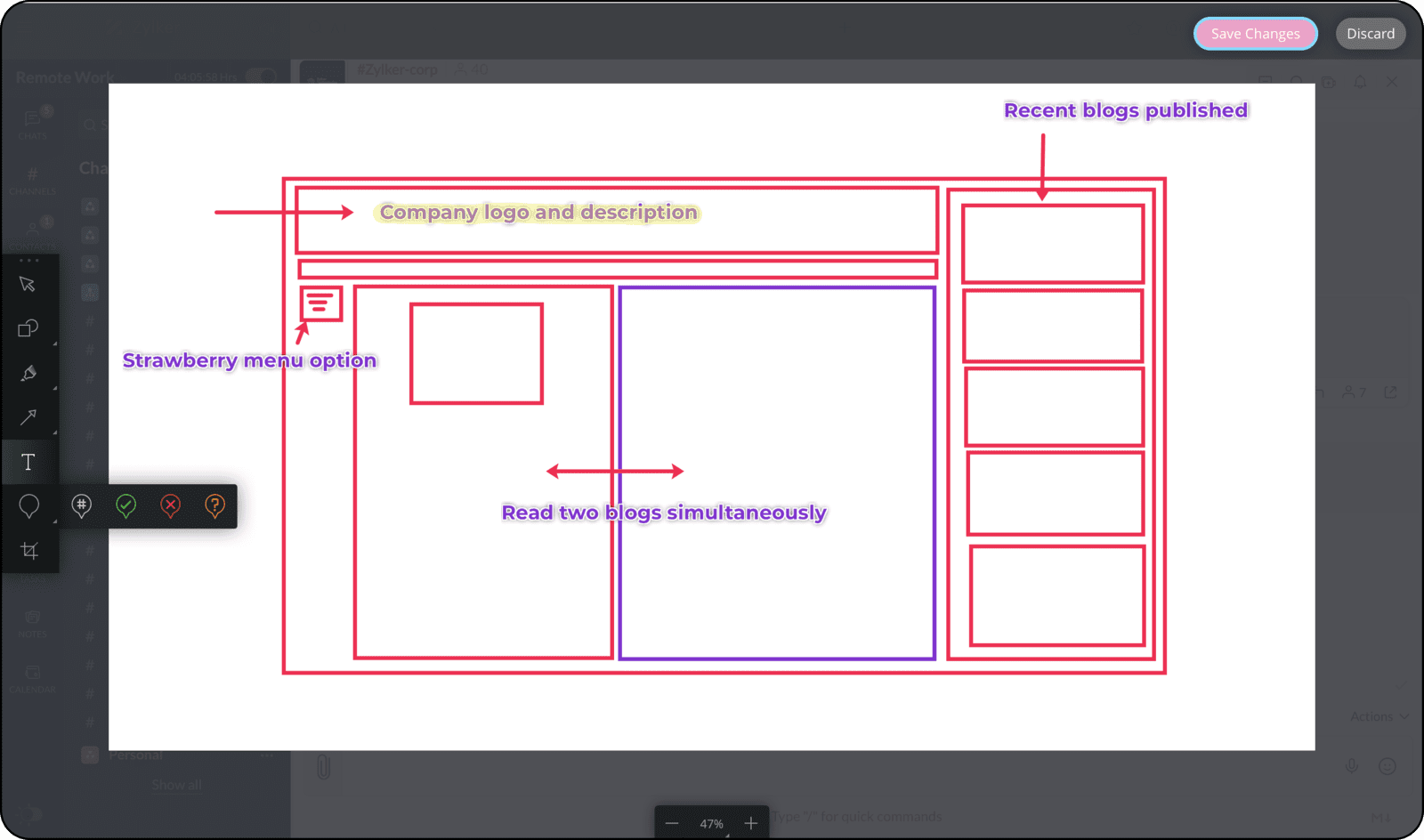 Po ustaleniu strategii, zespół zarządzający produktami będzie musiał współpracować z projektantami. Często projektanci mają trudności z wyjaśnieniem lub opisaniem pomysłów za pomocą słów. Korzystając z funkcji tablicy Cliq , możesz tworzyć rysunki swoich pomysłów i dzielić się nimi z zespołem, aby otrzymać cenny feedback. Tablice Cliq mogą być również używane podczas spotkań burzy mózgów.