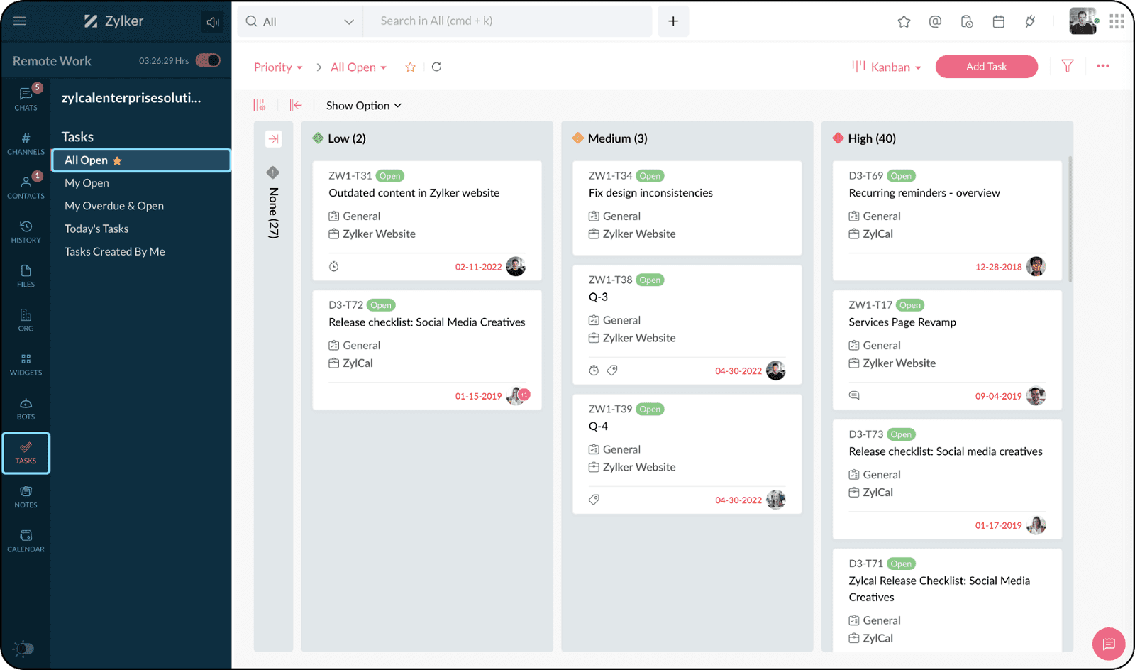 Dodatkowo integrując Zoho Projects z Cliq będziesz mógł tworzyć zadania i przydzielać je członkom zespołu w zależności od priorytetu. Równie przydatne są kanały organizacji do komunikowania się z innymi zespołami oraz kanały zespołu do komunikowania się wewnętrznie z członkami w celu zdefiniowania swoich celów i planów do realizacji.