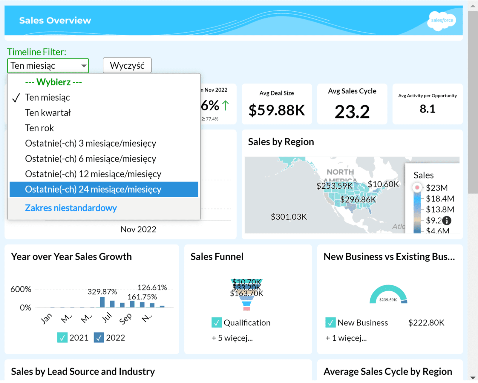 Zapoznaj się z gotowym pulpitem nawigacyjnym Podglądu Sprzedaży dla Salesforce CRM poniżej. Podobnie możesz przeglądać inne gotowe raporty i pulpity nawigacyjne, które możesz zintegrować z Zoho Analytics tutaj .