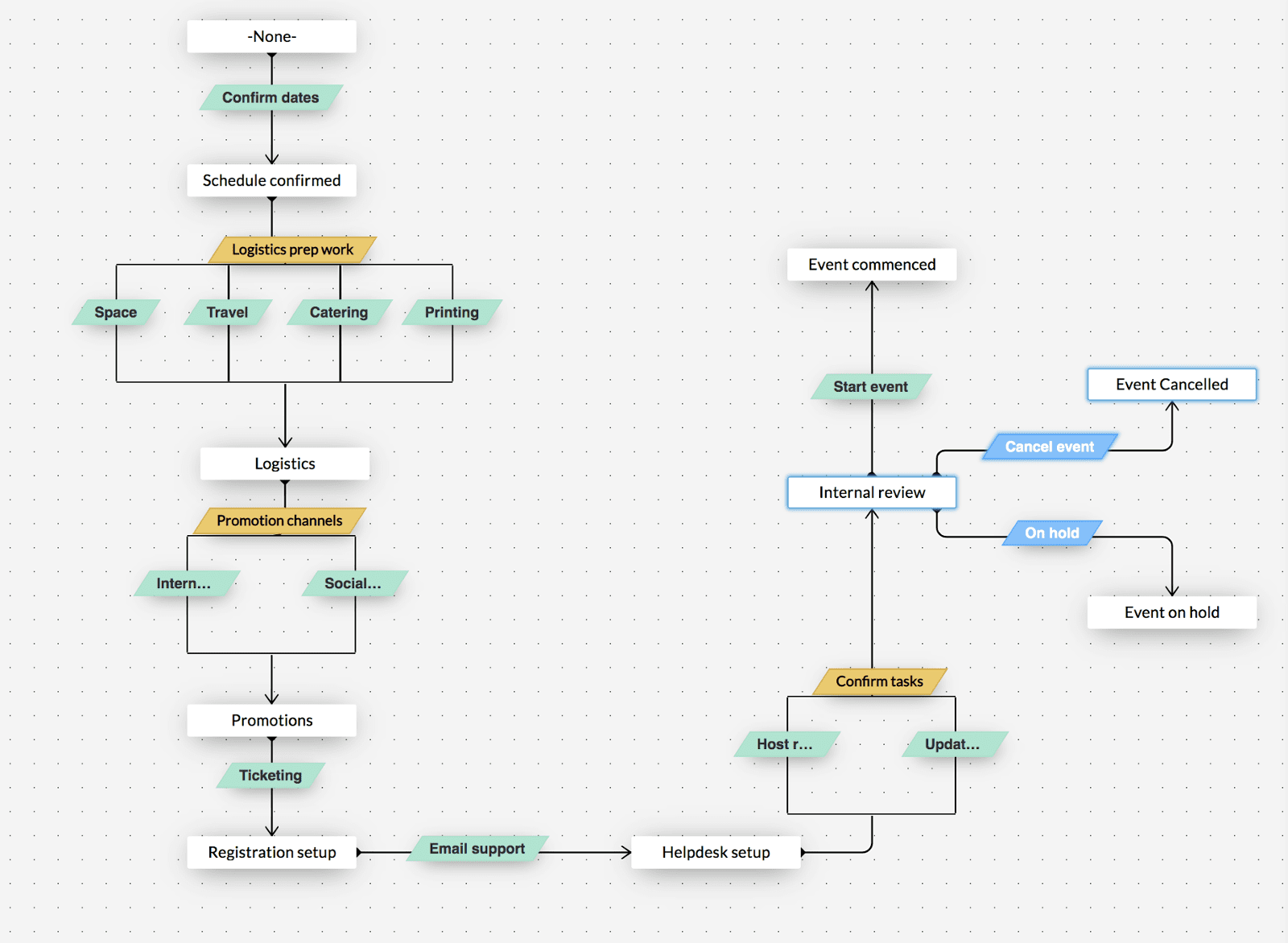 Możesz teraz mieć wiele przejść między dwoma sytuacjami, przy czym każde równoległe przejście jest inną czynnością, którą musi wykonać użytkownik lub zespół. Dopiero po zakończeniu wszystkich równoległych przejść rekord przejdzie do nowego etapu, który zdefiniowałeś. Daje to możliwość budowania bardziej kompleksowych procesów i lepszą kontrolę nad działaniami, które należy wykonać między różnymi etapami procesu.