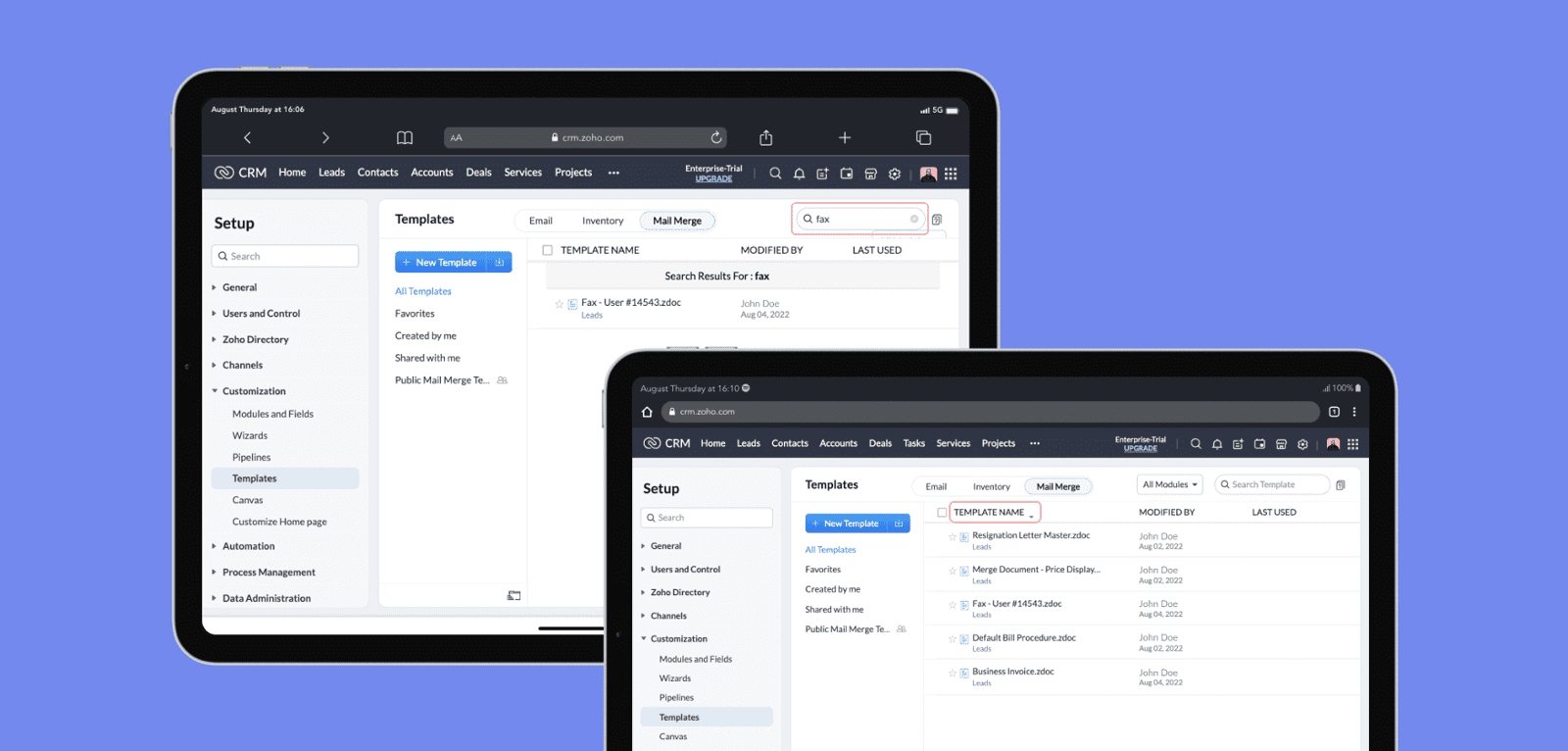 Teraz Twój zespół może to realizować za pomocą urządzeń przenośnych — zarówno telefonów komórkowych, jak i tabletów. Zoho CRM pozwala tworzyć szablony korespondencji seryjnej i zarządzać nimi, scalać dokumenty i konfigurować wymagane operacje po scaleniu z taką samą łatwością w przeglądarkach urządzeń mobilnych.