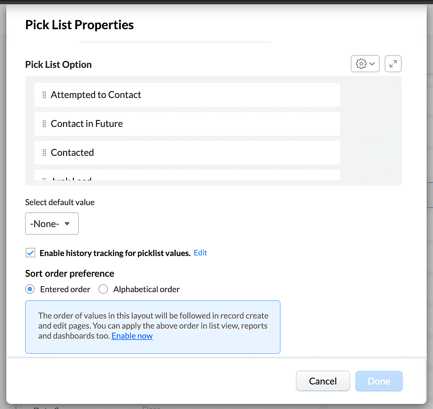 Aby pomóc Ci w pełni wykorzystać wartości pól na listach wyboru, Zoho wprowadziło możliwość sortowanie rekordów na podstawie wartości listy wyboru na dwa dodatkowe sposoby: według wprowadzonej kolejności lub porządku alfabetycznego. Te opcje sortowania będą stosowane podczas tworzenia i edytowania rekordów, widoków list, raportów i pulpitów nawigacyjnych.