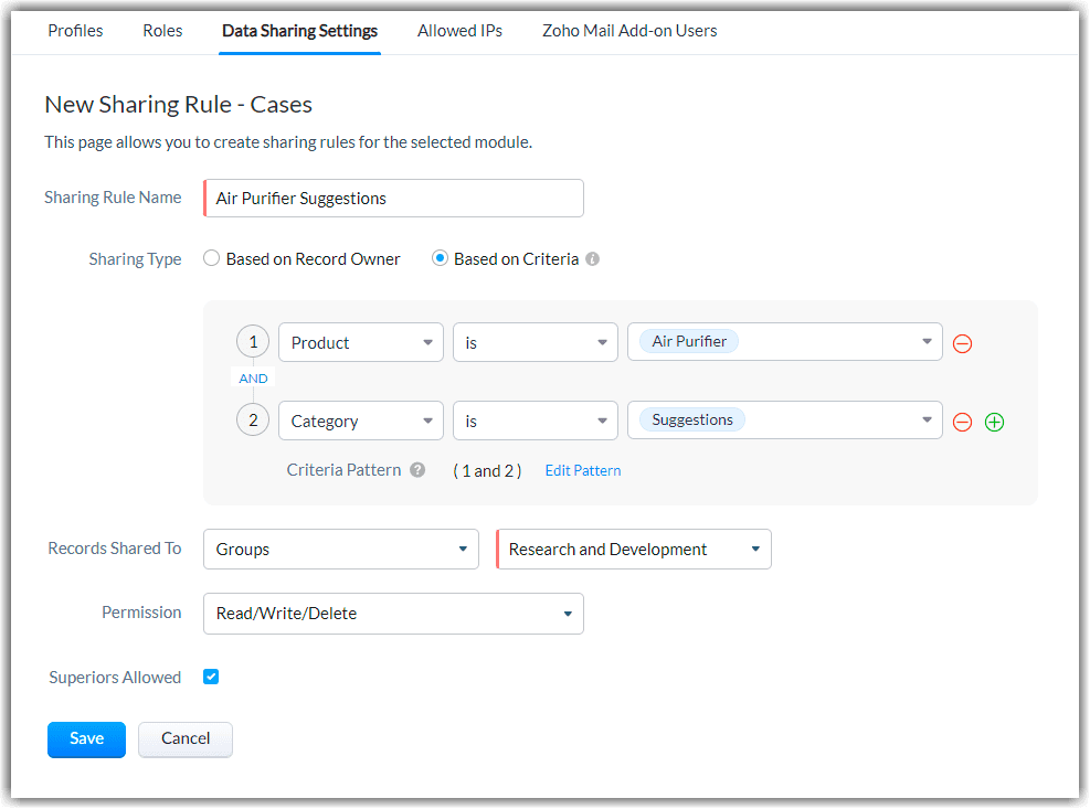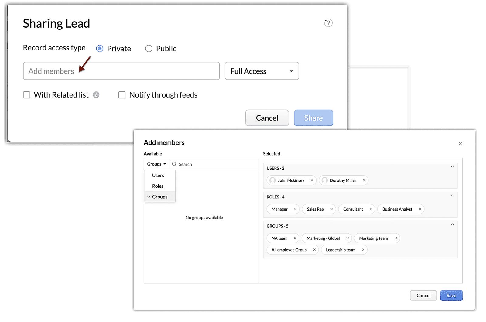 - Udostępnianie rekordów rolom i grupom użytkowników — jeśli masz określone rekordy, które chcesz udostępnić dla konkretnej roli lub większej grupie, możesz to zrobić dzięki najnowszemu ulepszeniu. Nowa funkcja umożliwia wybranie poszczególnych rekordów do udostępnienia różnym rolom i grupom użytkowników zdefiniowanym na koncie Zoho CRM.