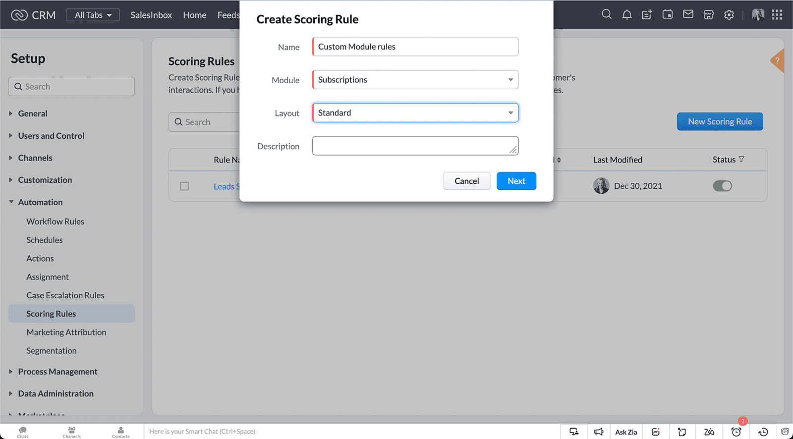 Możliwość tworzenia wielu reguł punktacji dała firmom swobodę tworzenia unikalnych modeli punktacji dla swoich potencjalnych klientów i kontaktów. Dzięki temu różne działy mogą łatwo oceniać i ustalać priorytety swoich zadań. Teraz idziemy o krok dalej. Zoho wprowadziło obsługę modułów niestandardowych, która umożliwia rozszerzenie unikalnych modeli oceniania również na moduły niestandardowe.