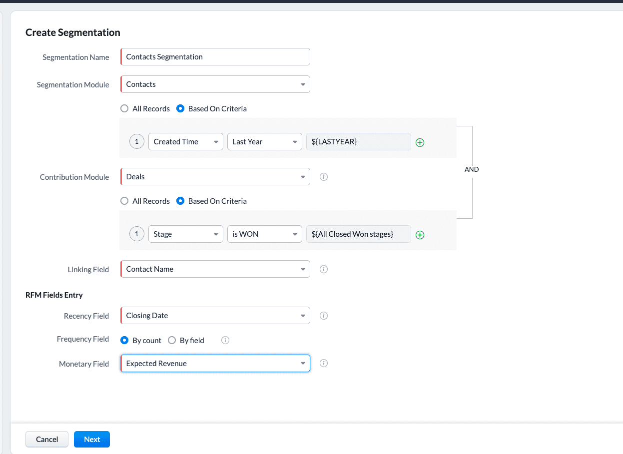 Teraz wprowadzone kolejne warstwy segmentacji, dzięki którym możesz jeszcze bardziej je udoskonalać. Możesz teraz określić kryteria rekordów z modułu wnoszącego, które Zoho CRM ma brać pod uwagę podczas przeprowadzania segmentacji.