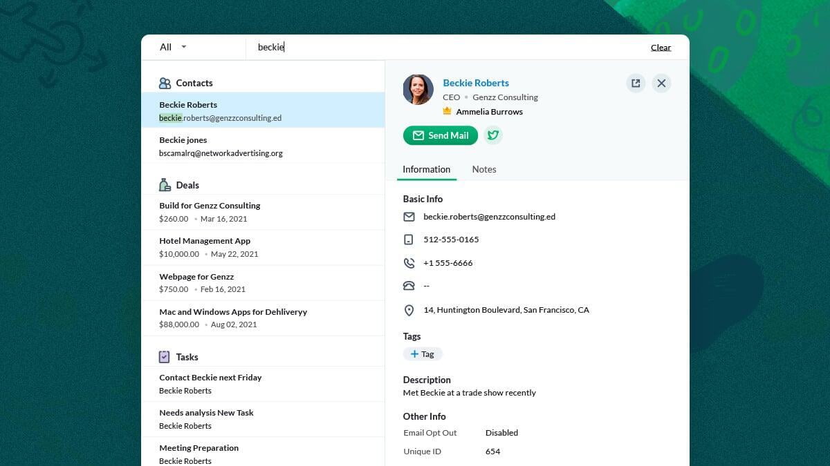 W tym roku zdynamizowane funkcję wyszukiwania, aby ograniczyć czynności wymagane do wyszukiwania i edytowania rekordów. Na przykład, jeśli potrzebujesz znaleźć kontakt, aby edytować jego numer telefonu lub zmienić jego właściciela na innego użytkownika, byłby to wieloetapowy proces wyszukiwania kontaktu, kliknięcia go, odwiedzenia modułu, wprowadzenia zmian i następnie ich zapisywanie. Dlatego teraz możesz edytować rekordy bezpośrednio z paska wyszukiwania, bez konieczności odwiedzania modułu, do którego należy rekord.