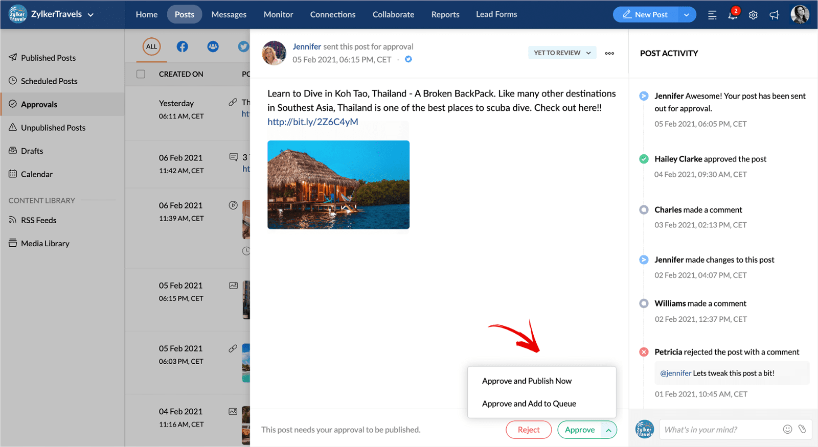 Dzięki nowym funkcjom zatwierdzania treści i przepływu pracy możesz teraz lepiej współpracować ze swoim zespołem przy przenoszeniu treści w strumieniu. Możesz to zrobić, konfigurując własny system zatwierdzania i optymalizując schemat publikowania w mediach społecznościowych. Do opcji zatwierdzania na pulpicie nawigacyjnym możesz przypisać określonych członków zespołu jako osoby zatwierdzające. Będą mogły one moderować i publikować wersje robocze. Możesz również nadawać statusy osobom z twojego teamu jako wydawcy lub współtwórcy. W ten sposób zespoły mogą mieć większą kontrolę redakcyjną nad wychodzącymi treściami.