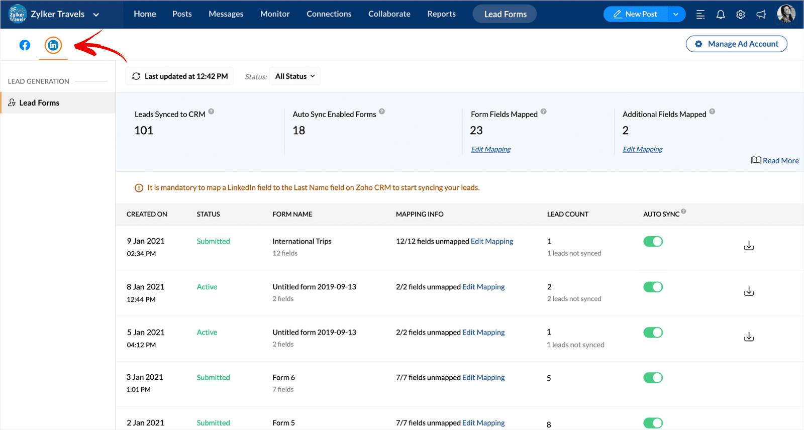 Dzięki nowej integracji LinkedIn Lead Ads w Zoho Social, twoja praca z LinkedIn będzie jeszcze lepsza . To przydatny dodatek do pulpitu nawigacyjnego, który może pomóc w zarządzaniu wszystkimi potencjalnymi klientami zebranymi z formularzy LinkedIn.