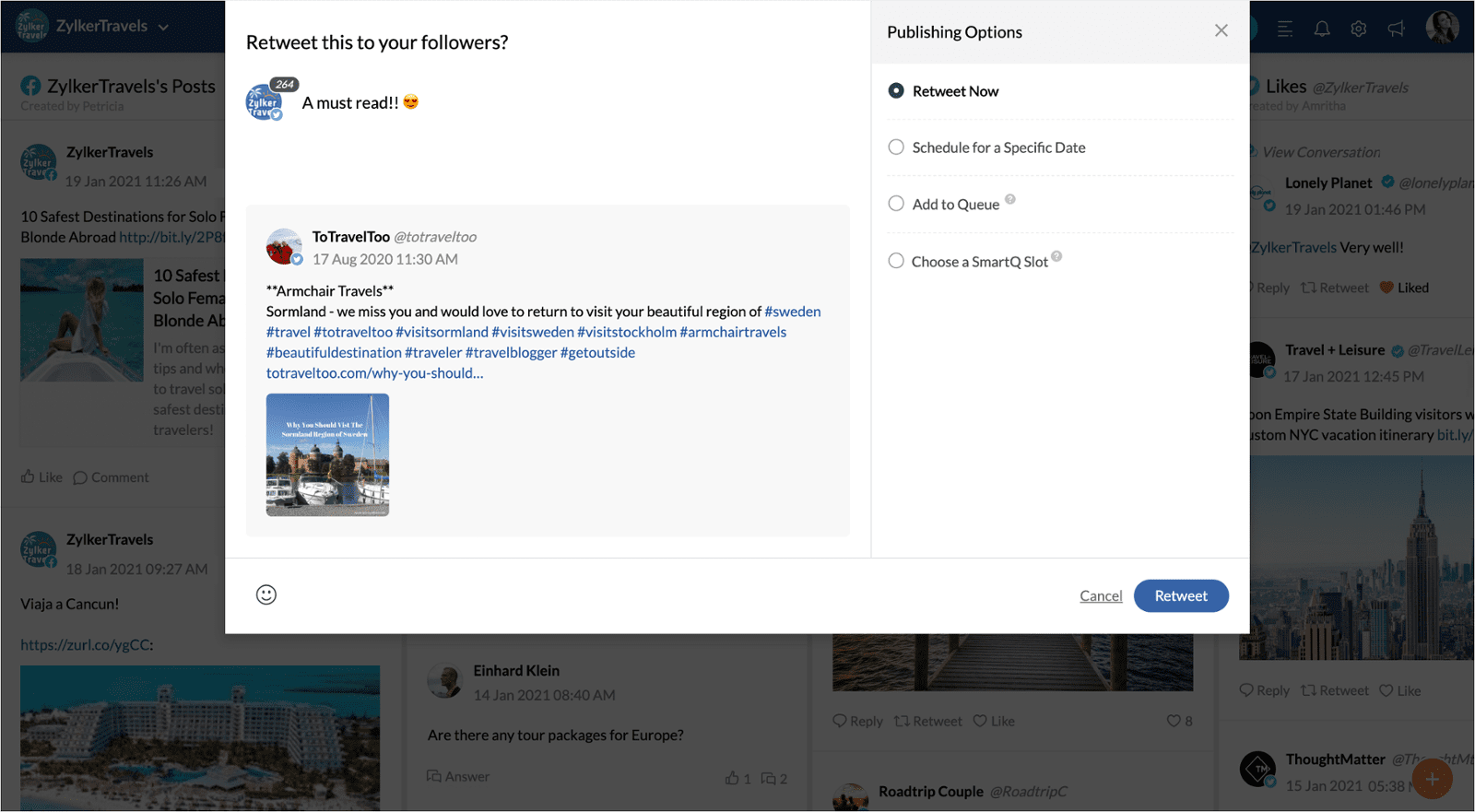 Znalazłeś interesującego tweeta lub post na Facebooku, który chcesz udostępnić? Naciskając przycisk zShare, który pojawia się pod tweetem lub postem, możesz to zrobić bezpośrednio lub zaplanować na później.