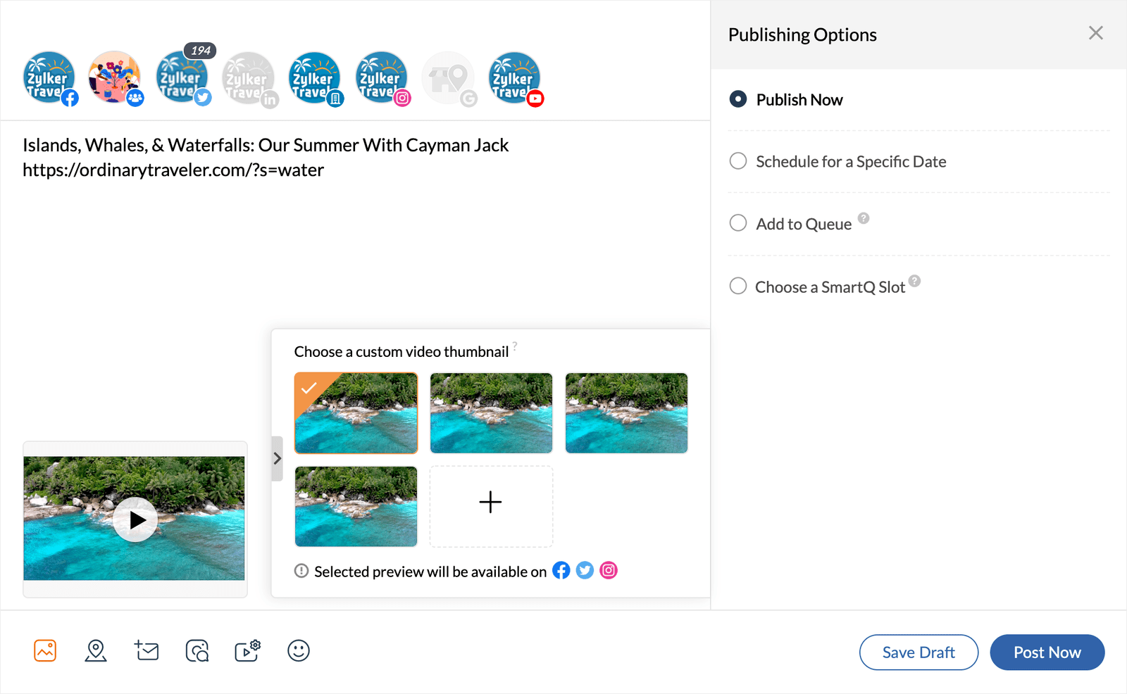 To nie wszystko! Zoho Social pozwala teraz ustawić niestandardową miniaturę wideo dla Twoich treści podczas publikowania. Funkcja niestandardowych miniatur pozwala wybrać miniaturę z ramek wideo lub skorzystać z sugestii miniatur Zoho Social. Możesz również przesłąć wybrany obraz lub projekt, aby dodać je jako miniatury filmów.