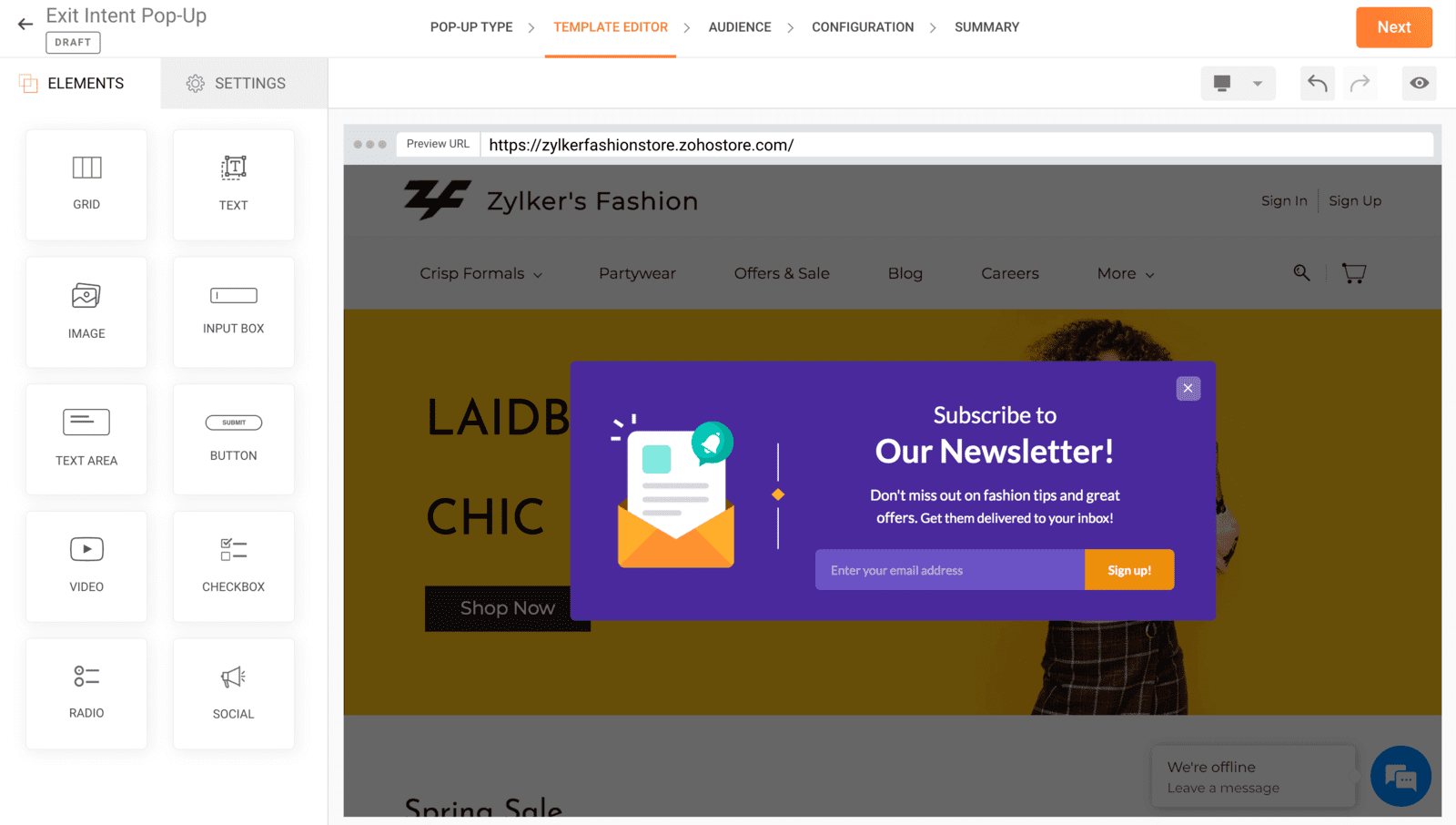 PageSense oferuje trzy typy wyskakujących okienek - modalne, wsuwane i banery. Możesz wybrać wszystko: od wyglądu wyskakujących okienek po rozmieszczenie i wyzwalacze. Zaplanuj wyskakujące okienka, gdy użytkownik wyląduje na Twojej stronie, próbuje ją opuścić, wydał określoną kwotę na przeczytanie treści lub gdy przewinie stronę do połowy. Możesz nawet tworzyć niestandardowe wyzwalacze, aby dostosować je do swoich celów marketingowych.