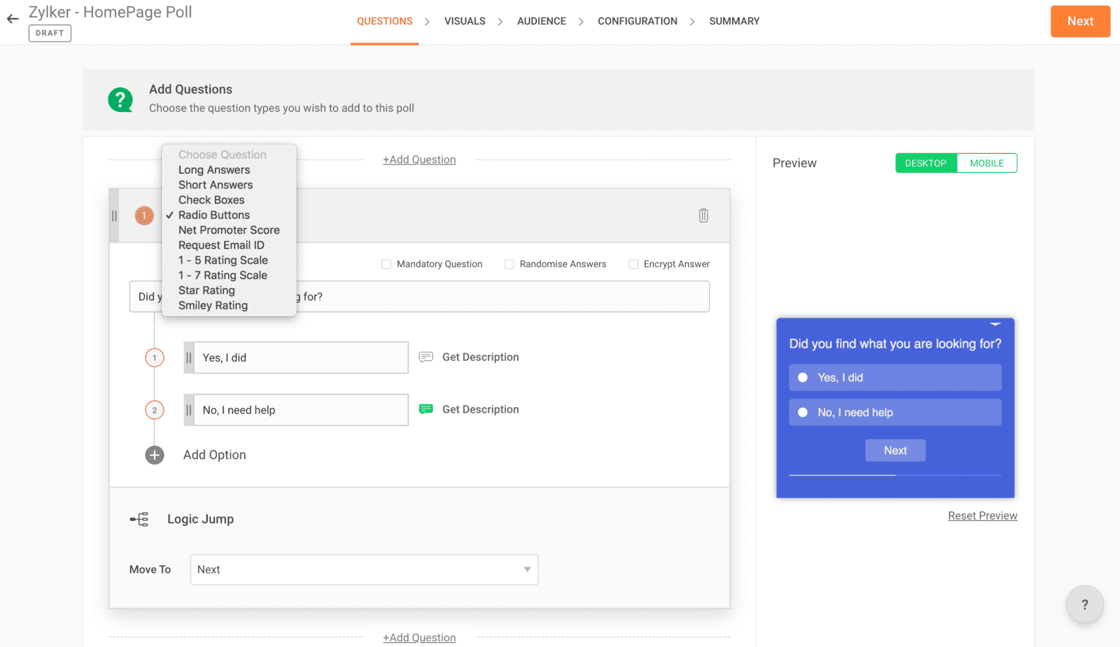 Ankiety PageSense zawierają 10 różnych typów pytań, dzięki czemu możesz z łatwością przeprowadzić badania eksploracyjne, opisowe i przyczynowe. Przeprowadź ankiety Net Promoter Score (NPS), aby zobaczyć, co przyciąga ruch do Twojej witryny. Dowiedz się czy odwiedzający będą Cię polecać innym oraz zidentyfikuj promotorów marki, osoby pasywne i krytyków. Utwórz ocenę w postaci gwiazdek, aby zobaczyć poziom zadowolenia swoich gości. Ankiety dają nieograniczone możliwości analizy i oceny Twojej witryny.