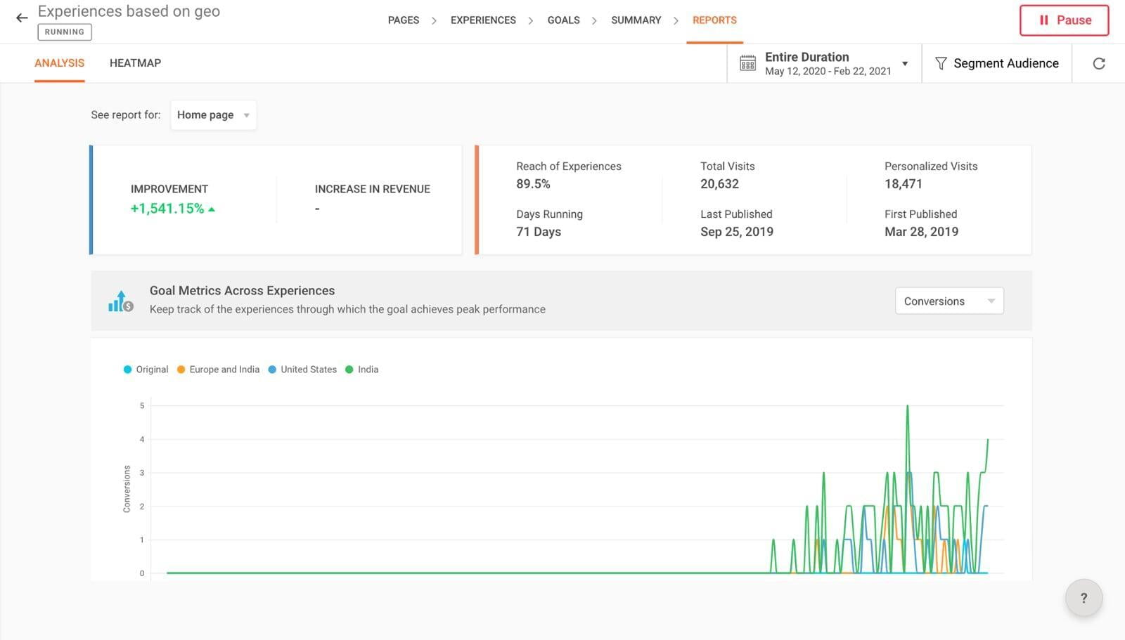 Po uruchomieniu testów PageSense automatycznie generuje dwa rodzaje raportów - Mapa termiczna i Analiza - w których można badać zachowanie i działania odwiedzających. Dzięki mapie termicznej możesz zobaczyć, jak użytkownicy wchodzą w interakcję z każdym elementem, w tym z rozwijanym menu, paskami nawigacyjnymi, obrazami i treścią na stronie. Dzięki Analizie możesz podsumować raporty personalizacji z różnych środowisk, segmentów odbiorców i różnych innych danych.