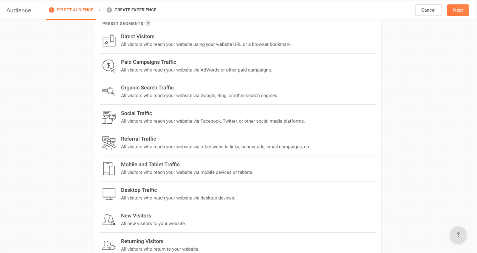 Wybierz określoną grupę użytkowników, dla których chcesz przeprowadzić ten eksperyment. Możesz wybrać własny segment odbiorców lub jedną z naszych istniejących wstępnie zdefiniowanych grup. Na przykład, jeśli chcesz stworzyć atrakcję dla powracających użytkowników, możesz wybrać powracających użytkowników z predefiniowanych segmentów odbiorców.