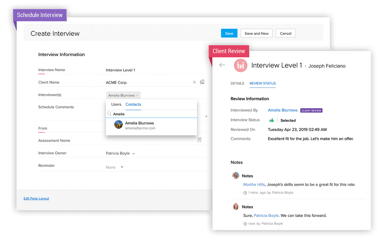 W miarę jak kandydaci przechodzą przez swoje aplikacje, ważne jest, aby także zaangażować klientów już na etapie rozmowy kwalifikacyjnej. Portal klienta Zoho Recruit umożliwia ocenę wyników rozmowy kwalifikacyjnej kandydata i dodawanie komentarzy, a wszystko to z poziomu jednego interfejsu.