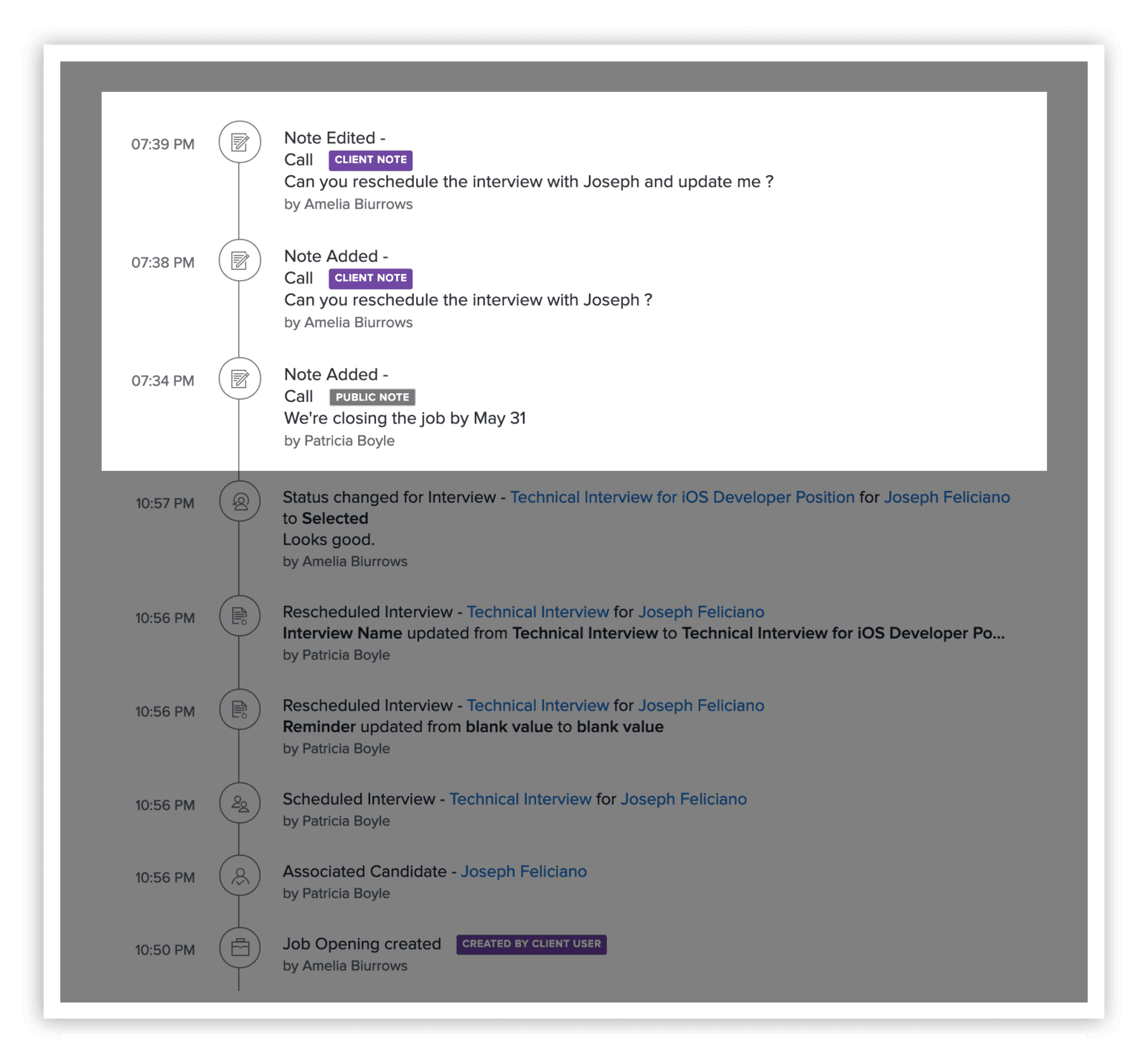 Gdy klienci dodają notatki podczas procesu rekrutacji, zostaniesz o tym poinformowany. Bieżąca historia wszystkich komentarzy klientów w Zoho Recruit gwarantuje, że nie przegapisz ważnych aktualizacji i komunikacja z klientem zawsze będzie na bieżąco.