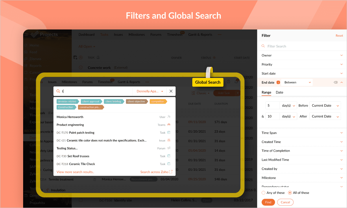 Projects 7 są wyposażone w zaawansowane filtry wyszukiwania i porównywania we wszystkich modułach. Grupujesz informacje za pomocą wstępnie zdefiniowanych, a także niestandardowych pól. Możesz szybko znaleźć to, czego szukasz, korzystając z ulepszonej opcji wyszukiwania, która obsługuje wyszukiwanie pełnotekstowe dla całego produktu.