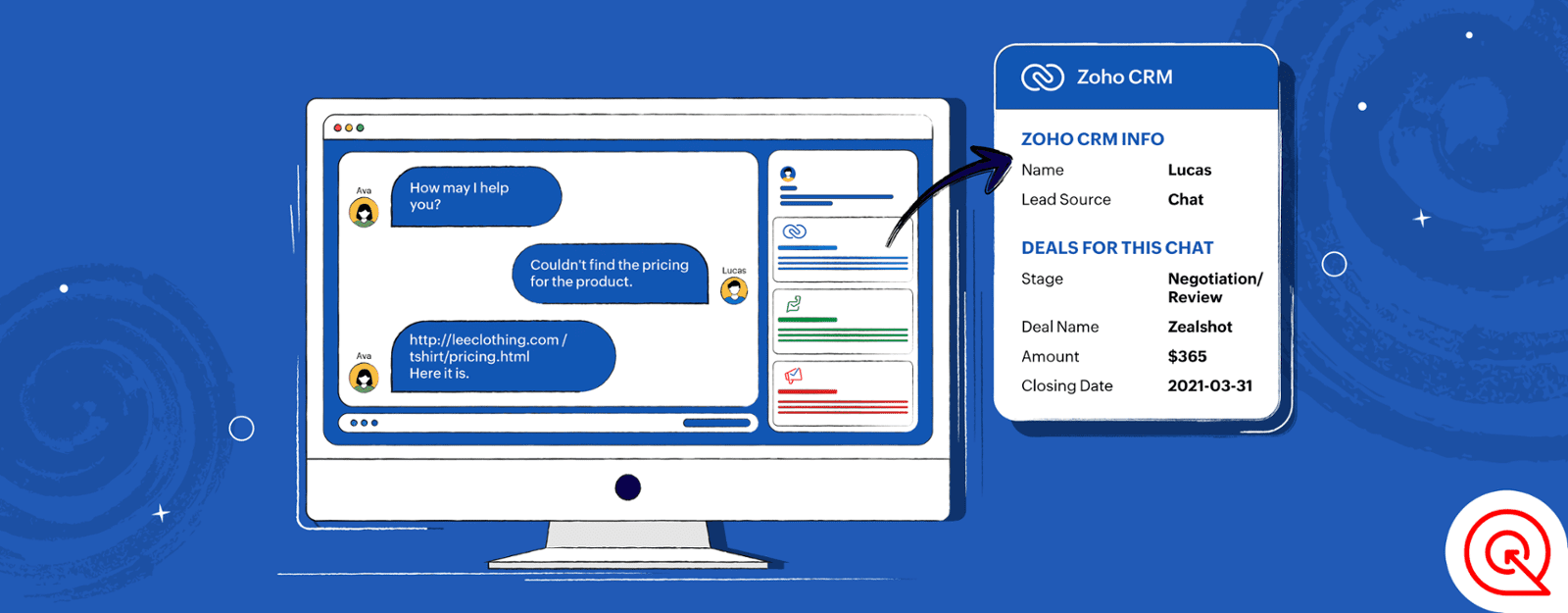 SalesIQ jest ściśle zintegrowany z Zoho CRM, co oznacza, że wszystkie informacje o odwiedzających płynnie przepływają przez te aplikacje bez konieczności ręcznego ingerowania. Korzystając z widżetów , możesz również przeglądać informacje kontaktowe CRM i zarządzać bieżącymi transakcjami bezpośrednio w SalesIQ.