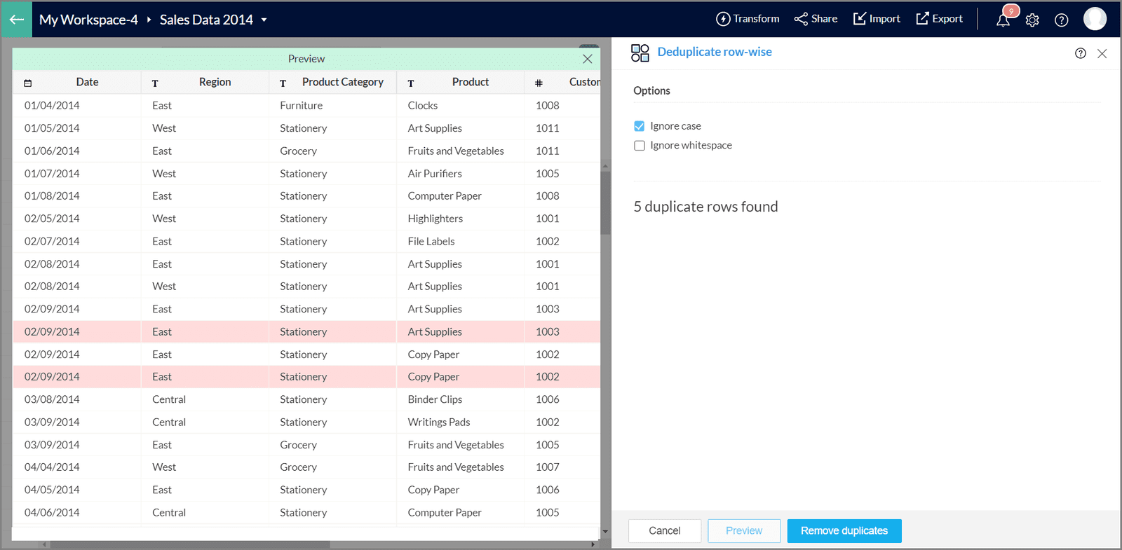 Zduplikowane wpisy to jeden z najczęstszych problemów z danymi. W rozbudowanych zestawach danych z wieloma wierszami i kolumnami często trudno jest dostrzec możliwe zduplikowane wpisy. Często wynika to z różnic w formie zapisu np. małe-wielkie litery. W tym miejscu może się przydać zastosowanie przekształcenia deduplikacji, które pomaga usunąć zduplikowane wpisy w ciągu kilku sekund.