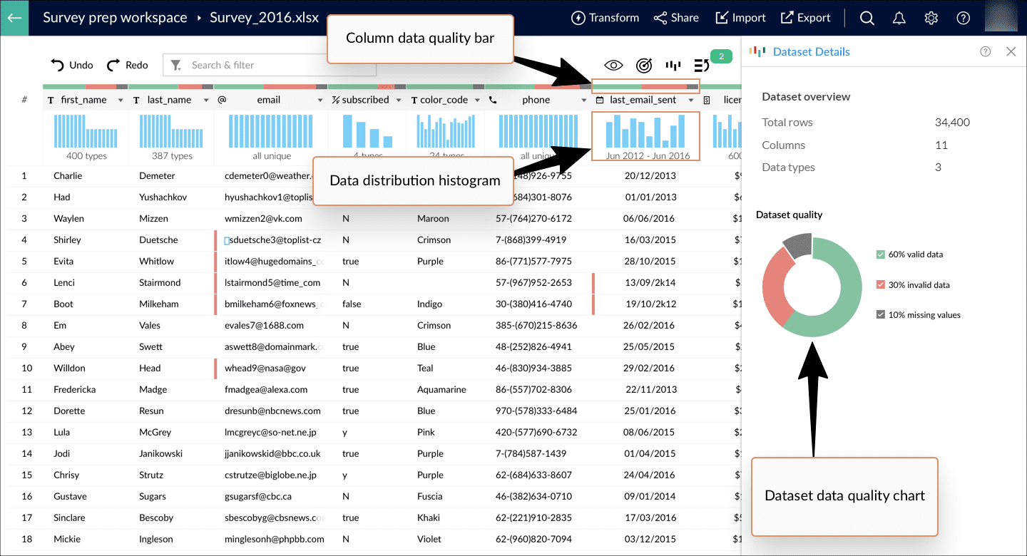 Nieprawidłowe wpisy w zestawach danych mogą prowadzić do problemów z dalszymi procesami, takimi jak analityka, uczenie maszynowe, magazynowanie danych i inne. Ponieważ nie zostaną one zaakceptowane przez większość baz danych lub narzędzi analitycznych, nieprawidłowe wartości utrudniają możliwość dokładnego przetwarzania lub analizowania zestawu danych. Dlatego konieczne jest ich czyszczenie przed importem, a to czasochłonny proces. W Zoho DataPrep Studio możesz importować dane z nieprawidłowymi wartościami, a każdy importowany zestaw danych jest automatycznie analizowany pod kątem jakości danych. Jest to wizualnie przedstawione na wykresach i histogramach, dzięki czemu użytkownicy mogą mieć szybki podgląd prawidłowych i nieprawidłowych wpisów, oprócz brakujących wartości.