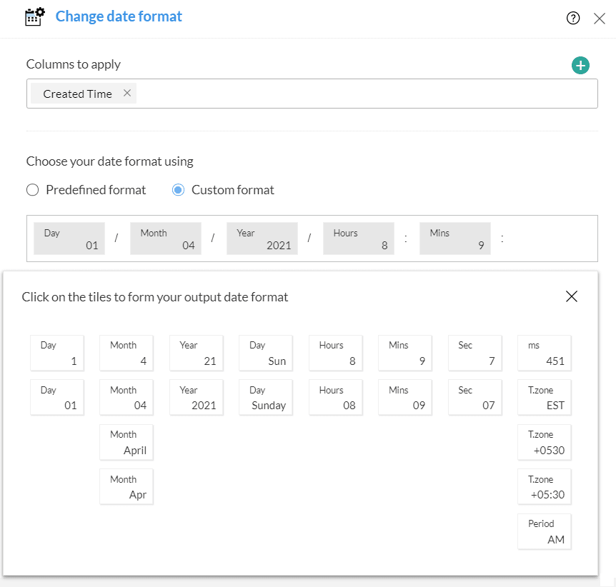 Zmień format daty w kolumnie daty, a Zoho DataPrep automatycznie udostępni opcje standaryzacji. Możesz wybrać jeden z predefiniowanych formatów lub stworzyć własny format.
