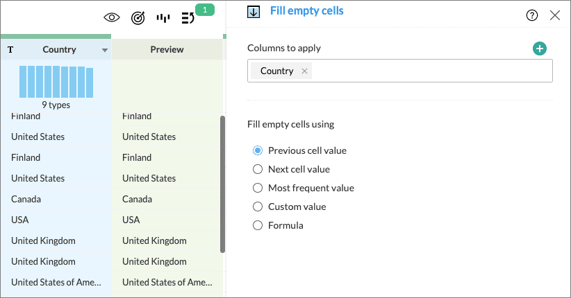 Korzystając z funkcji przekształcania kolumn wypełniania pustych komórek, użytkownicy mogą wybierać spośród wielu zalecanych logiki w celu wypełnienia pustych komórek. Opcje obejmują wypełnienie brakujących komórek „najczęstszą wartością”, „wartość średnią” lub „wartość niestandardową”.