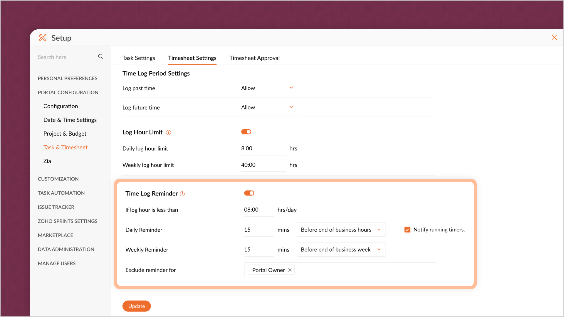 Nowe ustawienia grafików mogą pomóc w przypomnieniu kolegom z drużyny o ich wypełnieniu. Ustaw przypomnienia, aby powiadomić użytkowników o konieczności wprowadzenia ich dzienników czasu .
