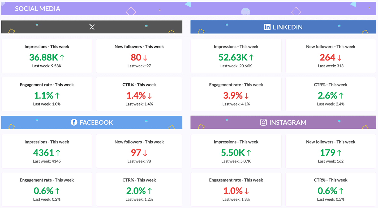 Poniżej przedstawiono fragment pulpitu nawigacyjnego, który ilustruje te dane dotyczące mediów społecznościowych.
