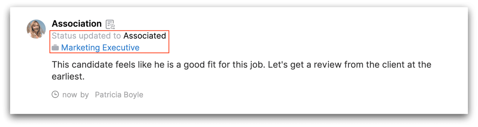 Wykonując różne czynności online możesz zostawiać komentarze adekwatne do sytuacji. Czy to skojarzenie kandydata z ofertą pracy lub przesłanie opinii na temat rozmowy kwalifikacyjnej, Twój komentarz pojawi się w sekcji notatek. Nazwa działania stanie się tytułem notatki.