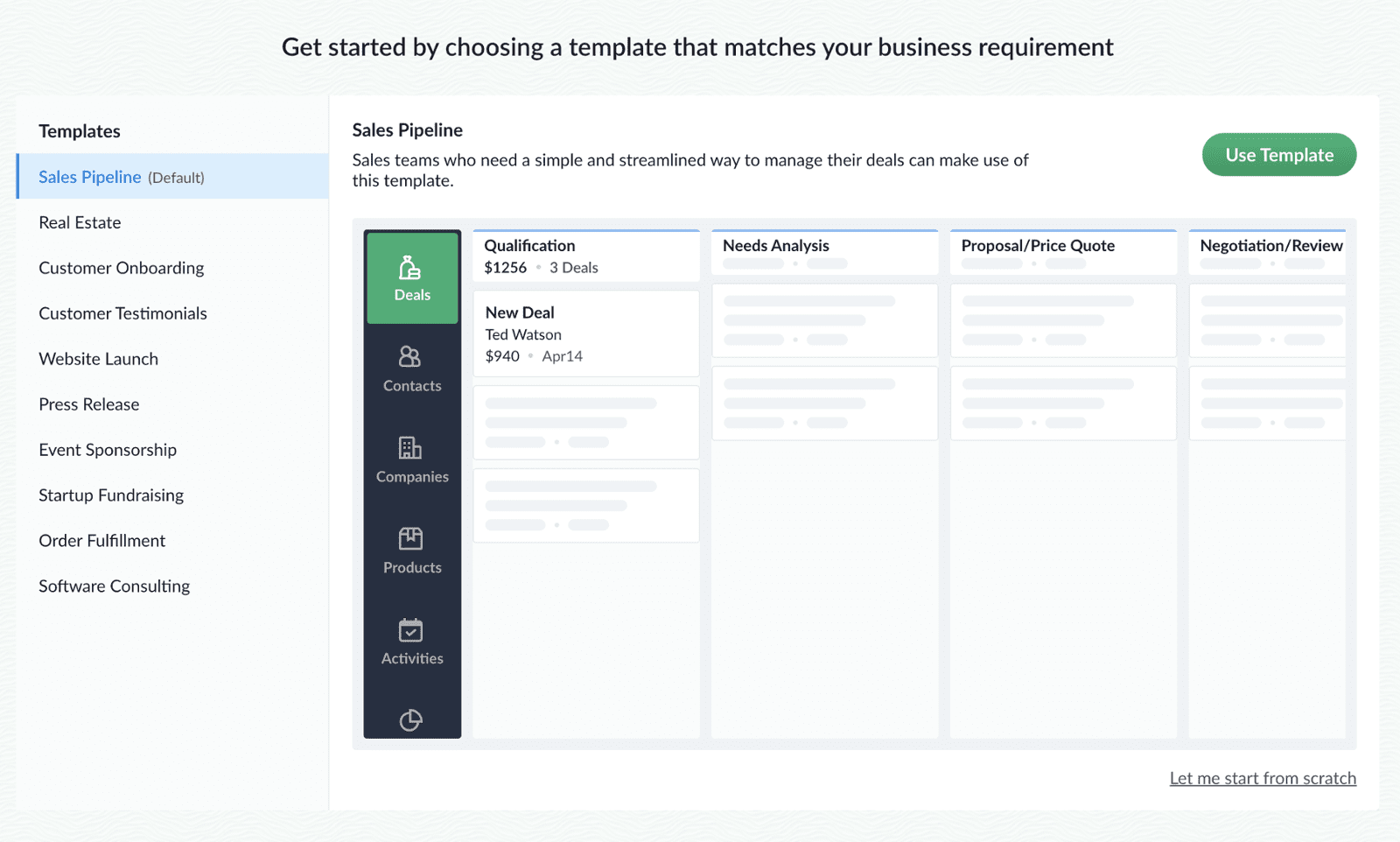 Bigin udostępnia teraz różne szablony dostosowane do niektórych z najpopularniejszych rodzajów firm korzystających z Zoho CRM. Dokładnie przestudiowaliśmy te rodzaje działalności, więc oto, czego możesz oczekiwać od szablonów Bigin dla Twojej firmy: