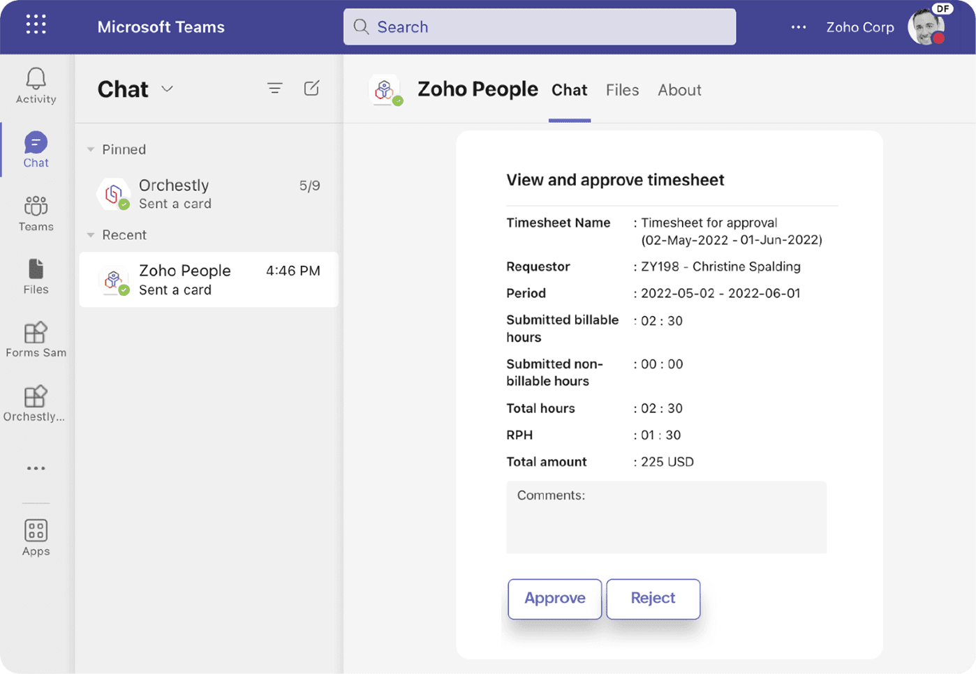 Jeśli Twoja organizacja korzysta zarówno z Zoho People, jak i Microsoft Teams, ta integracja pomoże pracownikom i menedżerom wykonywać niektóre z najważniejszych funkcji HR z poziomuTeams bez konieczności każdorazowego logowania się do Zoho People.