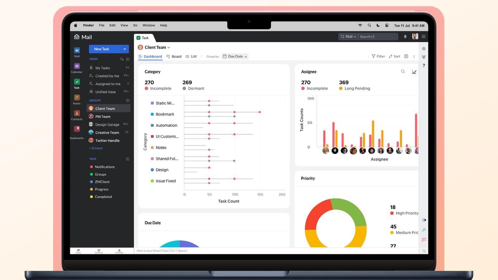Zoho ToDo oferuje również wizualny pulpit nawigacyjny, który przemieni analizę danych w rzeczywistą przyjemność. Wspierają to różne raporty i wykresy, które dają jasny obraz Twojego postępu. Prezentują one kluczowe informacje o zadaniach w różnorodnych formatach, które można modyfikować według potrzeb. Na przykład, jako lider zespołu, zobaczysz aktualne zadania w grupie czy porównasz postępy w zadaniach w ciągu miesiąca. Wyniki można dostosowywać używając różnych filtrów.